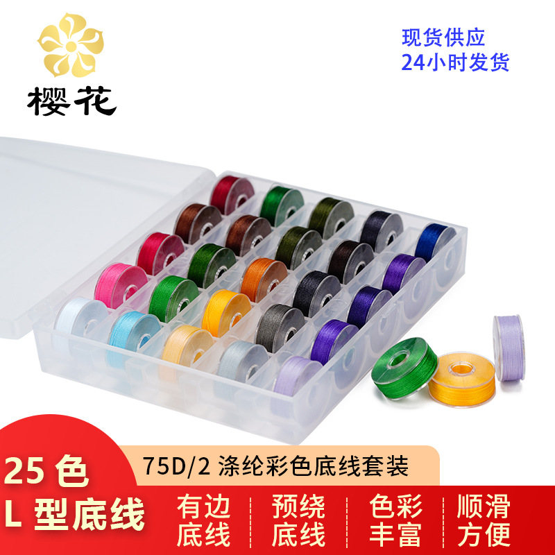 绣花线樱花牌75D/2涤纶彩色底线25色A型L型塑料边彩色底线套装