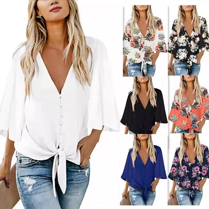 欧米風クロスボーダー夏の通勤用日焼け止めゆったりシフォン欧米風Vネック結び目シャツビーチリゾート外貿