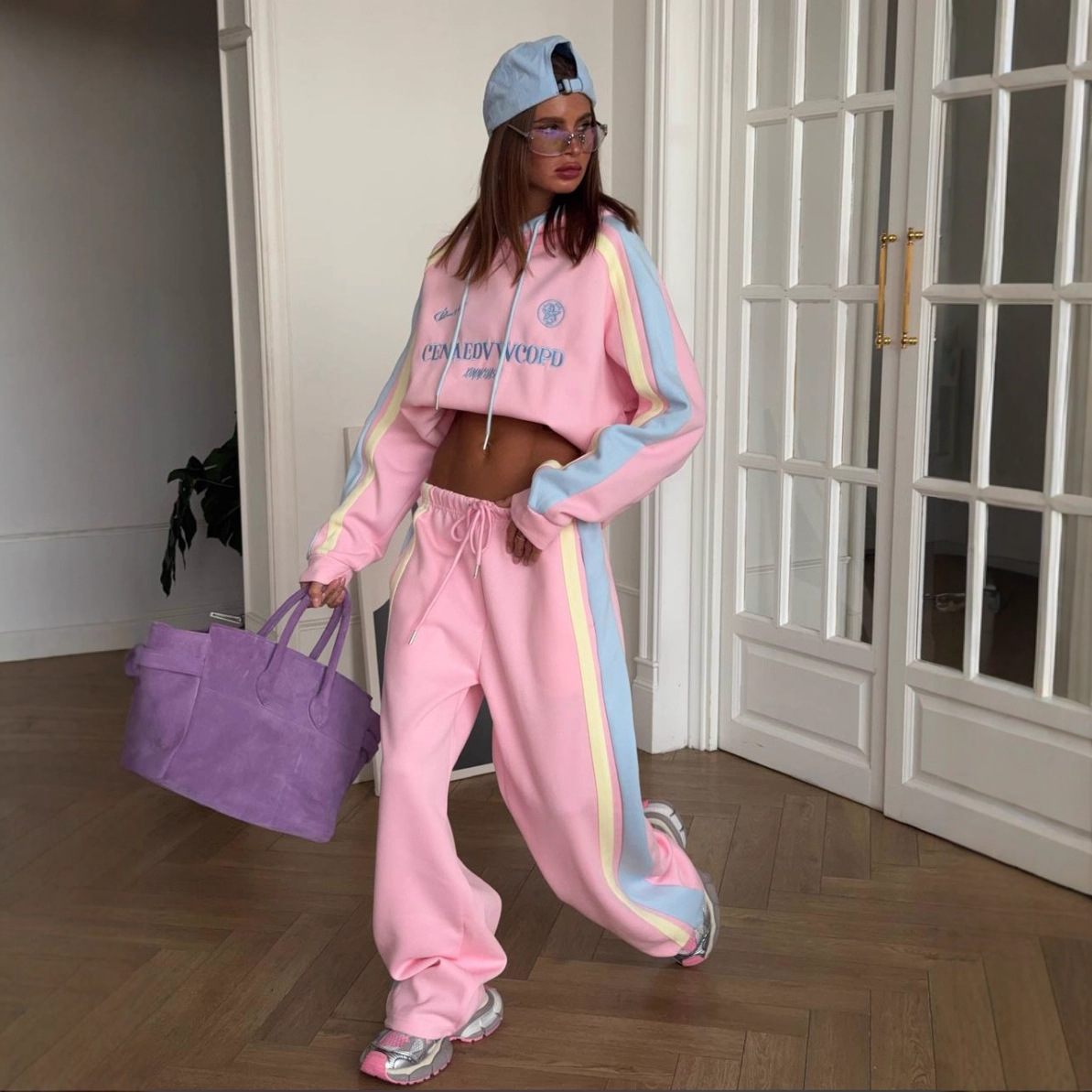 2025新款休闲撞色连帽卫衣直筒长裤两件套辣妹休闲运动粉色女批发