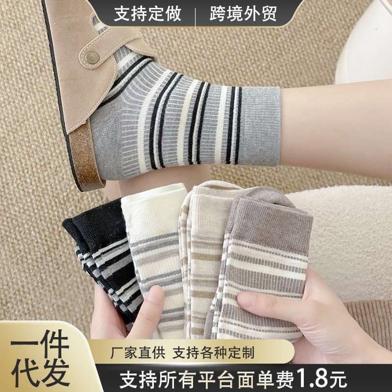 韩系条纹ins袜子女款春秋撞色宽松中筒长袜复古学院拼色堆堆长袜