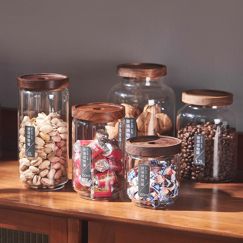 家庭用ガラス茶缶レトロアカシア木製蓋密封缶穀物キッチン収納缶キッチン透明収納缶