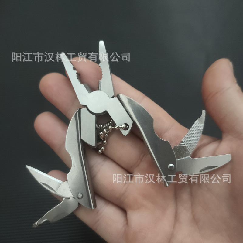 尼龙袋包装,折叠后是一个长径仅为5cm左右的椭圆!精巧入口袋。优质不锈钢材料,除钳子功能外还有小刀、十字批、小锉刀等部件。功能: