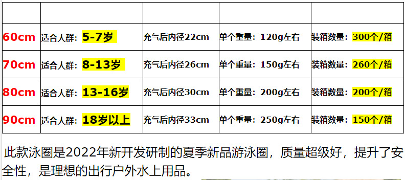 泳圈的实际尺寸表下面会有介绍