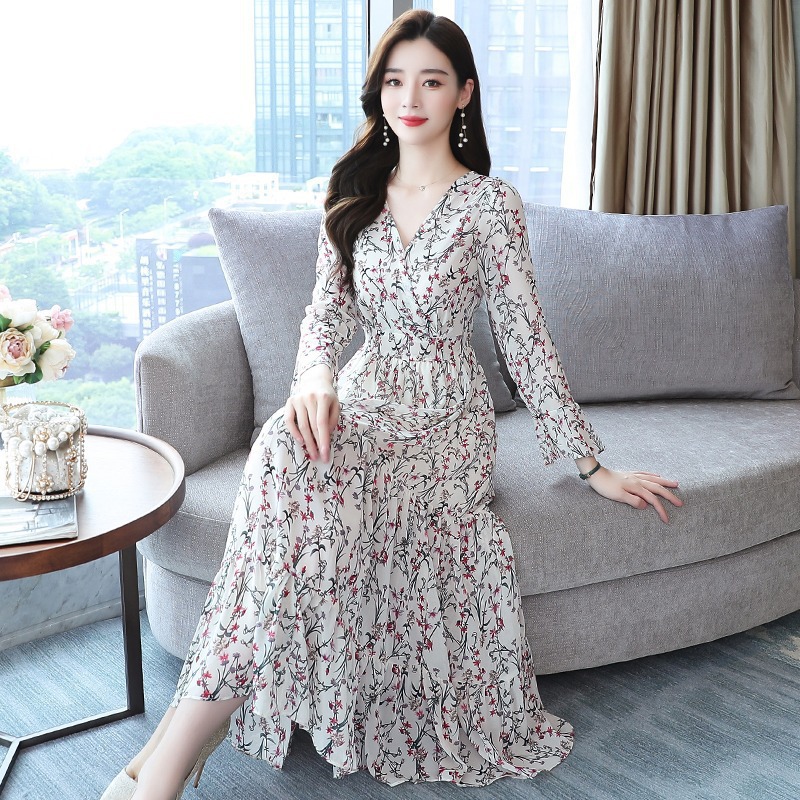 韓国シフォンドレス2025春秋新作レディースウエスト痩身長袖花柄プリーツロングスカート