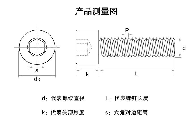 | 产品 规格 | 螺纹距 (P) | dk | k | s | t | |||