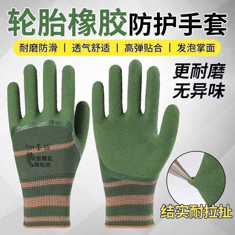 圣恒正品军绿轮胎橡胶劳保手套耐磨耐用防滑透气钢筋工柔软手套
