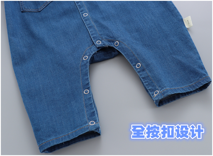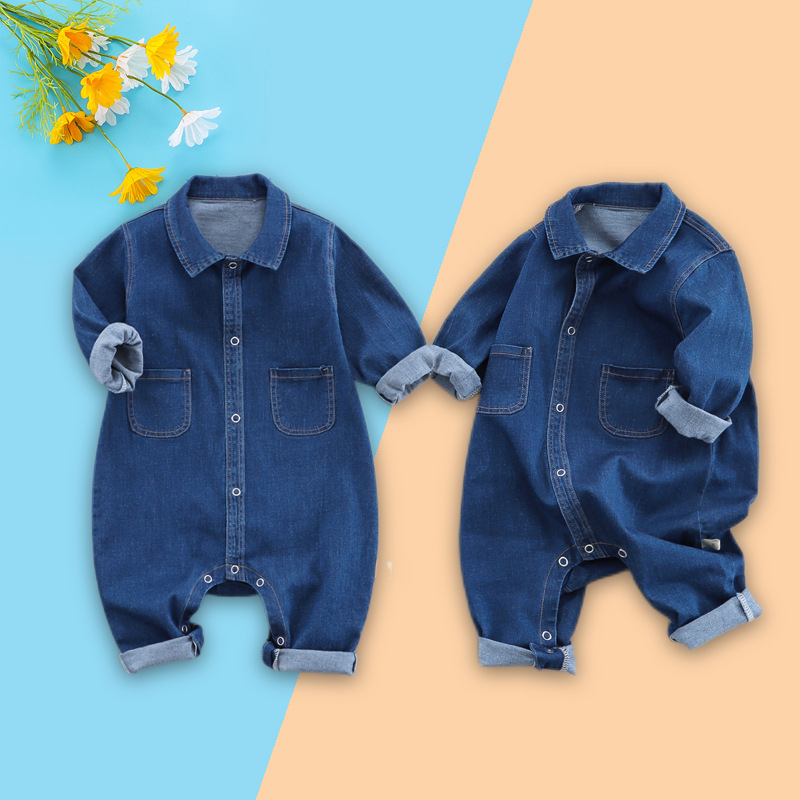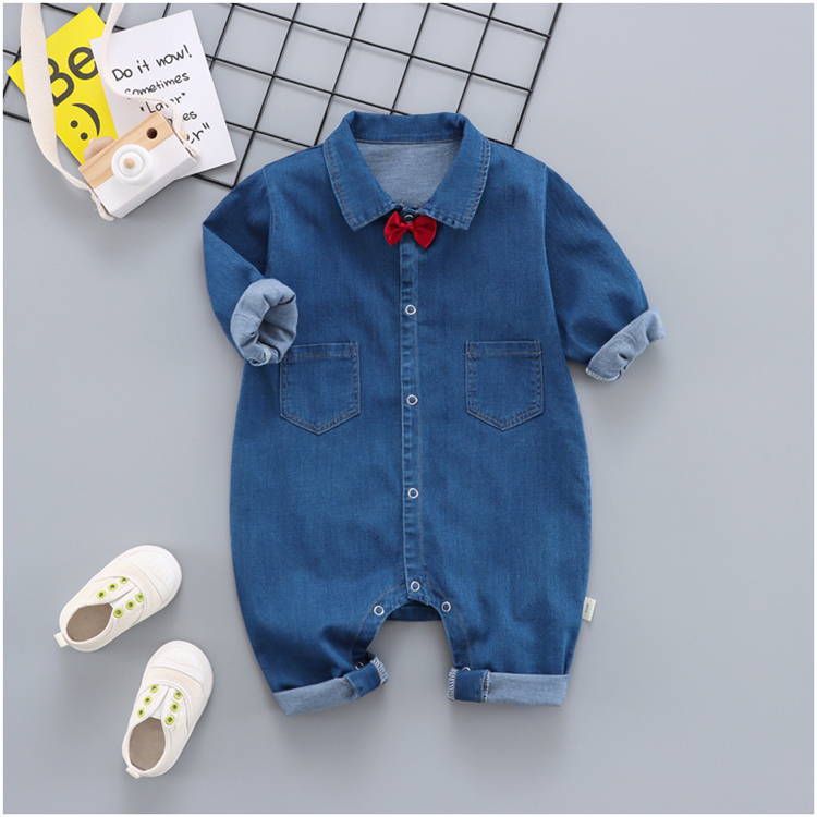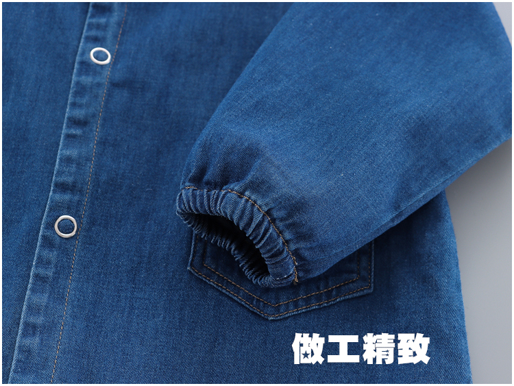 赤ちゃんのデニムのワンピースの春と秋の薄いタイプのコートの男女の赤ちゃんの服の小さい弾力の長袖は服を登って股を開けることができます。