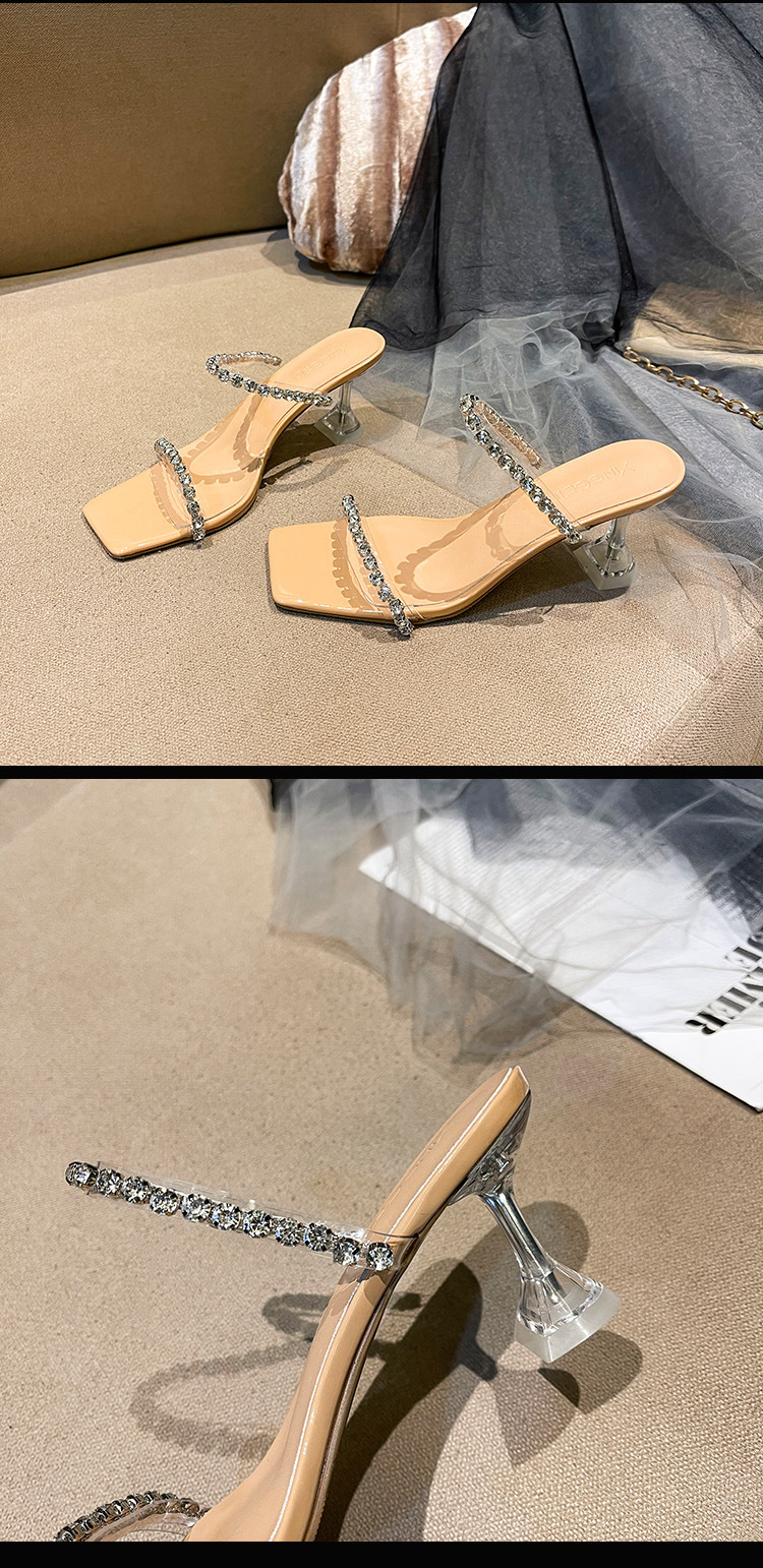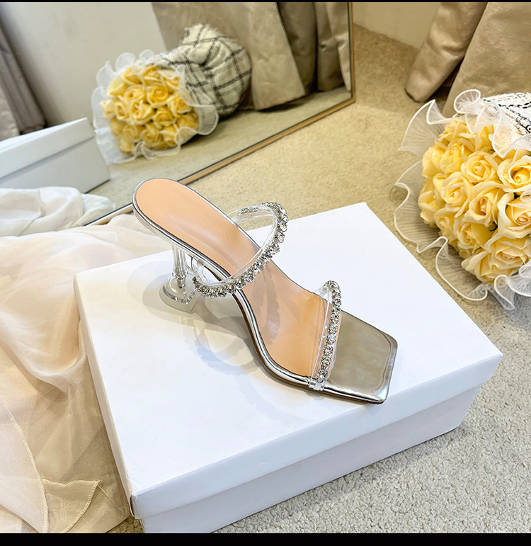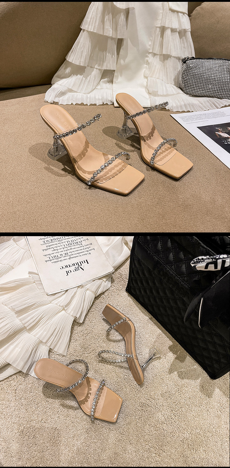 2025年夏季新款方头露趾水钻一字带凉拖鞋欧美风酒杯跟时尚凉鞋女