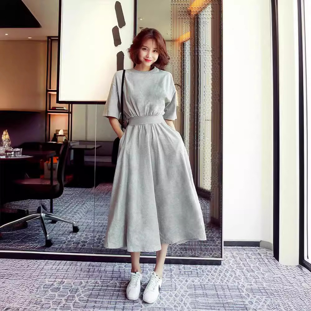 Insゆるい女装夏のロングタイプのウエストスカートが痩せて高級感がある韓系高腰学院風半袖ワンピース