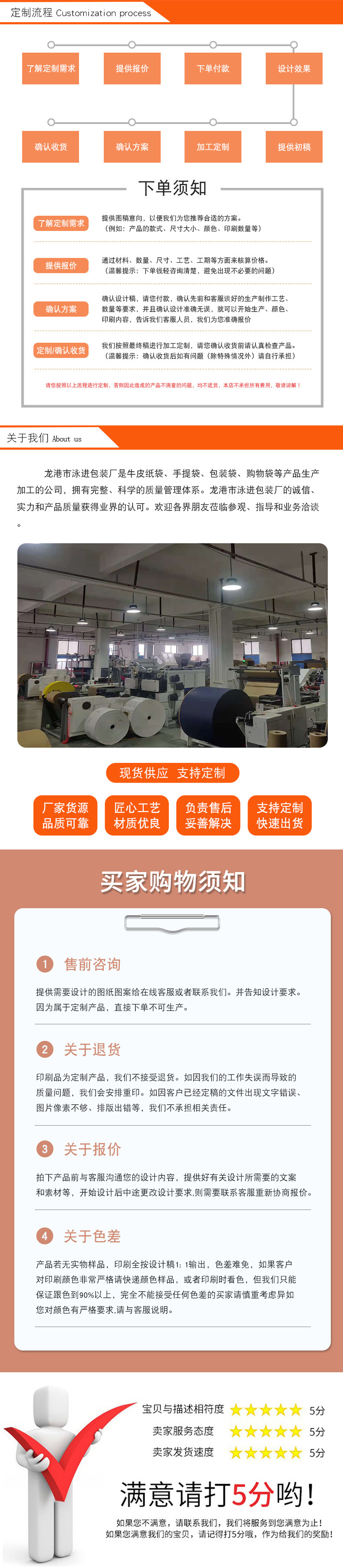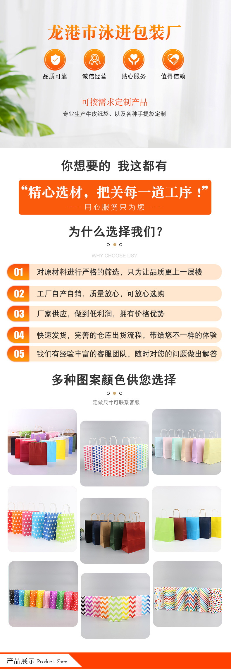 龙港市泳进包装厂是牛皮纸袋、手提袋、包装袋、购物袋等产品生产加工的公司,拥有完整、科学的质量管理体系。龙港市泳进包装厂的诚信、实力和产品质量获得业界的认可。欢迎各界朋友莅临参观、指导和业务洽谈。