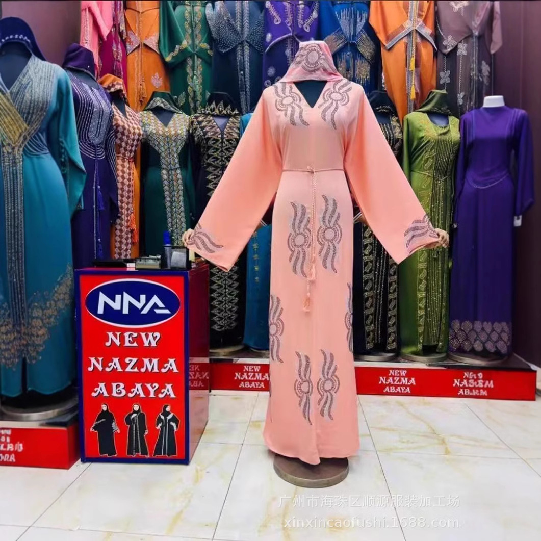 アフリカ、ヨーロッパ、アメリカ向けのクロスボーダーワンピース、シフォン生地、重厚な刺繍とラインストーン付きロングドレス、中東風半袖婦人服8623