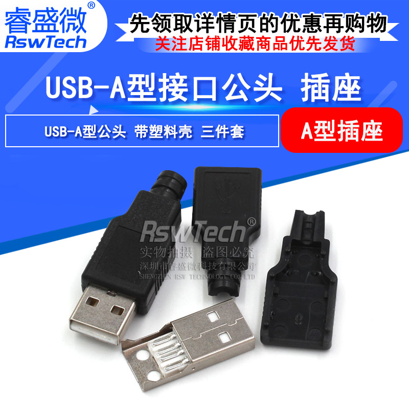 睿盛微a公溶接線式usb a型公座4p4線プラスチックカバー快速殻公頭三点セット
