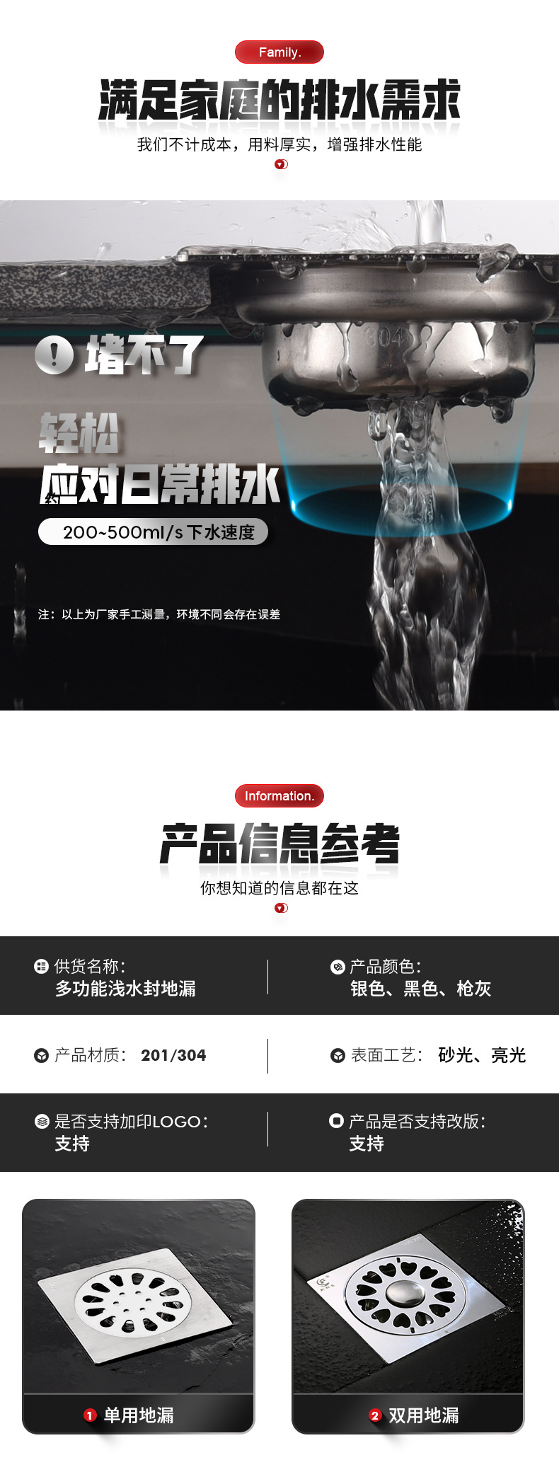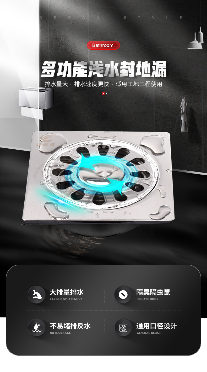 不锈钢地漏大排量卫生间阳台通用地漏家用厨卫轻奢加厚防臭地漏