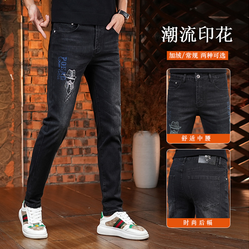 2023年四季トレンドブランドデニムパンツメンズ重工ティアラプリントストレッチスリムフィット万能ブラックメンズパンツトレンド