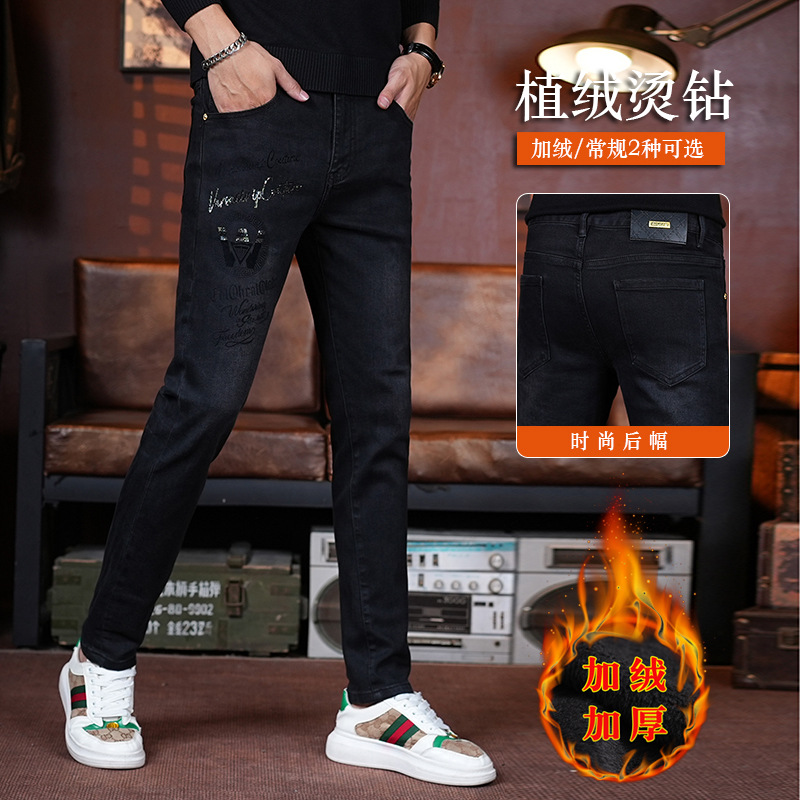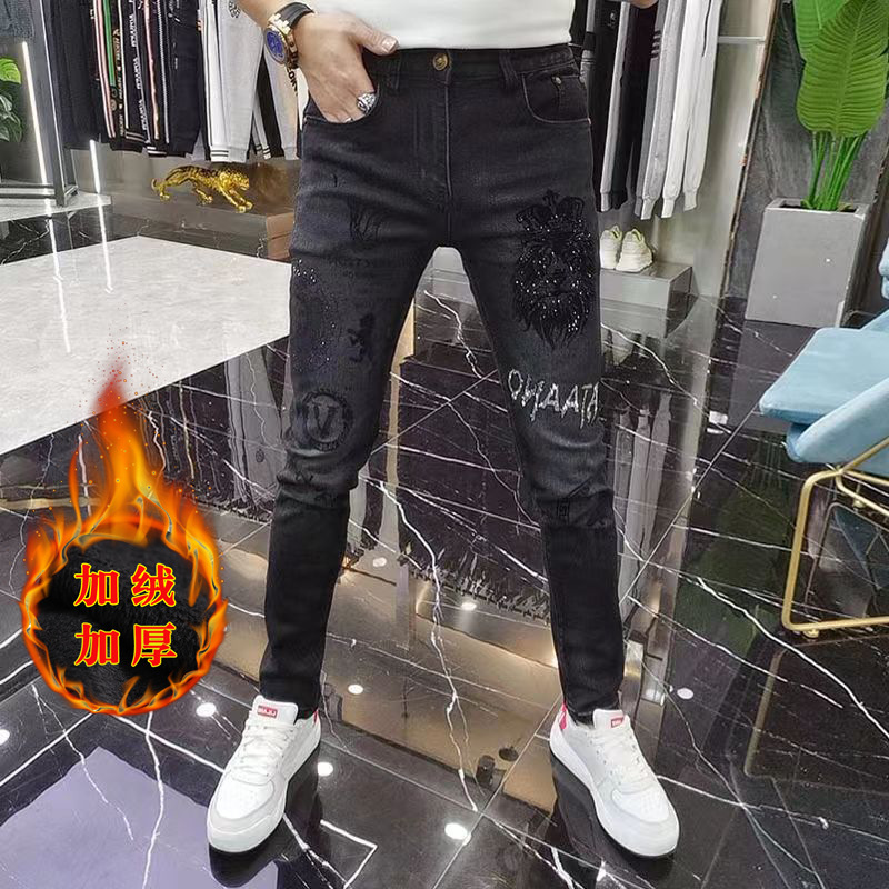 高端黑色男士2025冬季新款潮牌烫钻修身小脚百搭加绒牛仔裤长裤