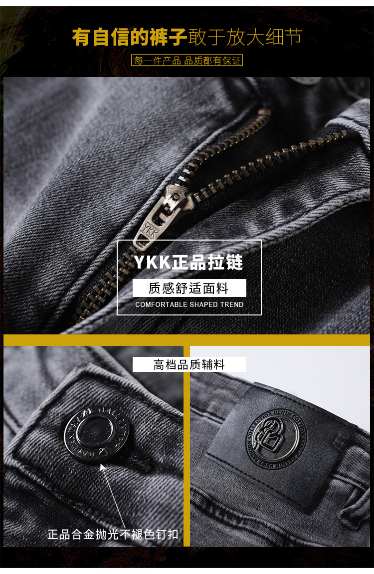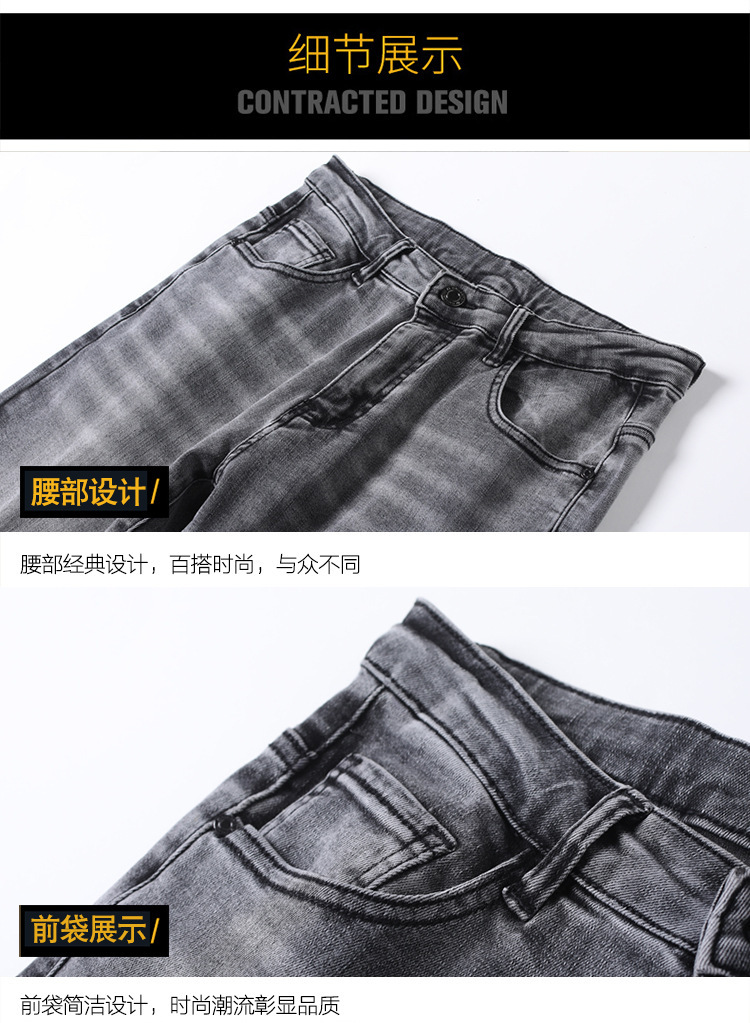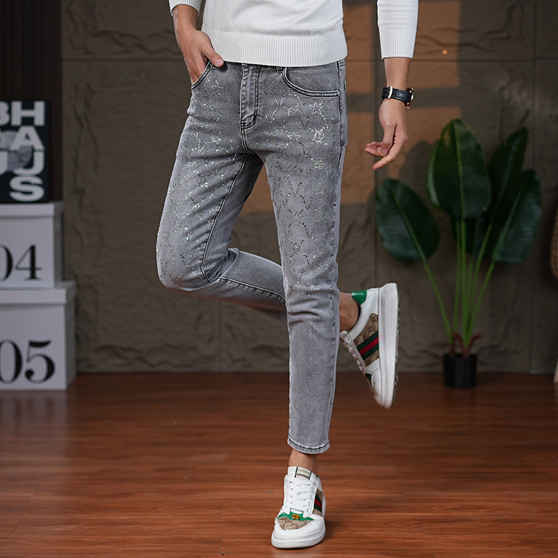 高端烟灰色牛仔裤男士2026春季新款潮牌烫钻修身小脚百搭弹力九分