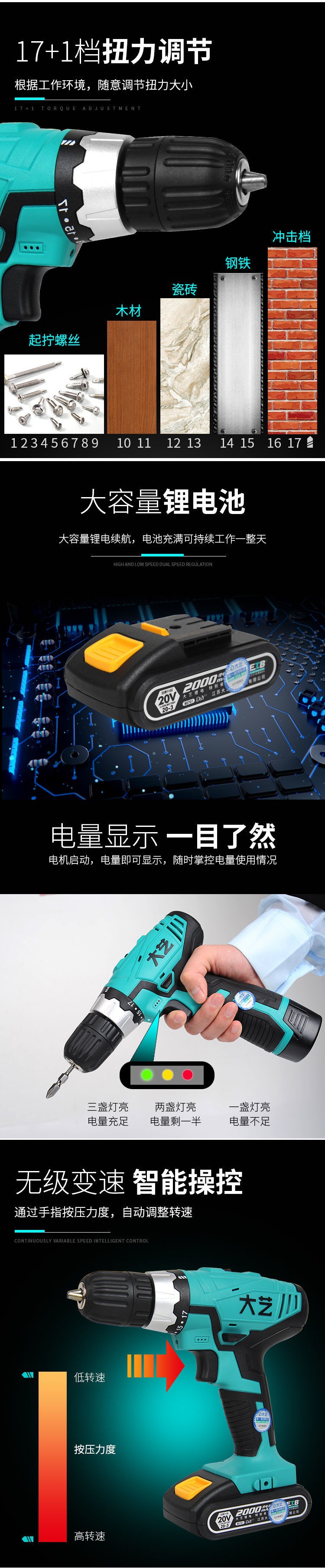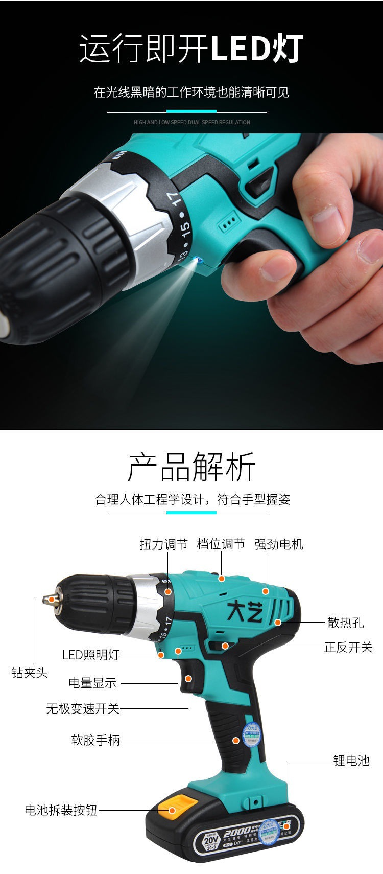 大艺原装正品充电式电钻家用锂电双速大扭矩充电钻多功能手电钻有