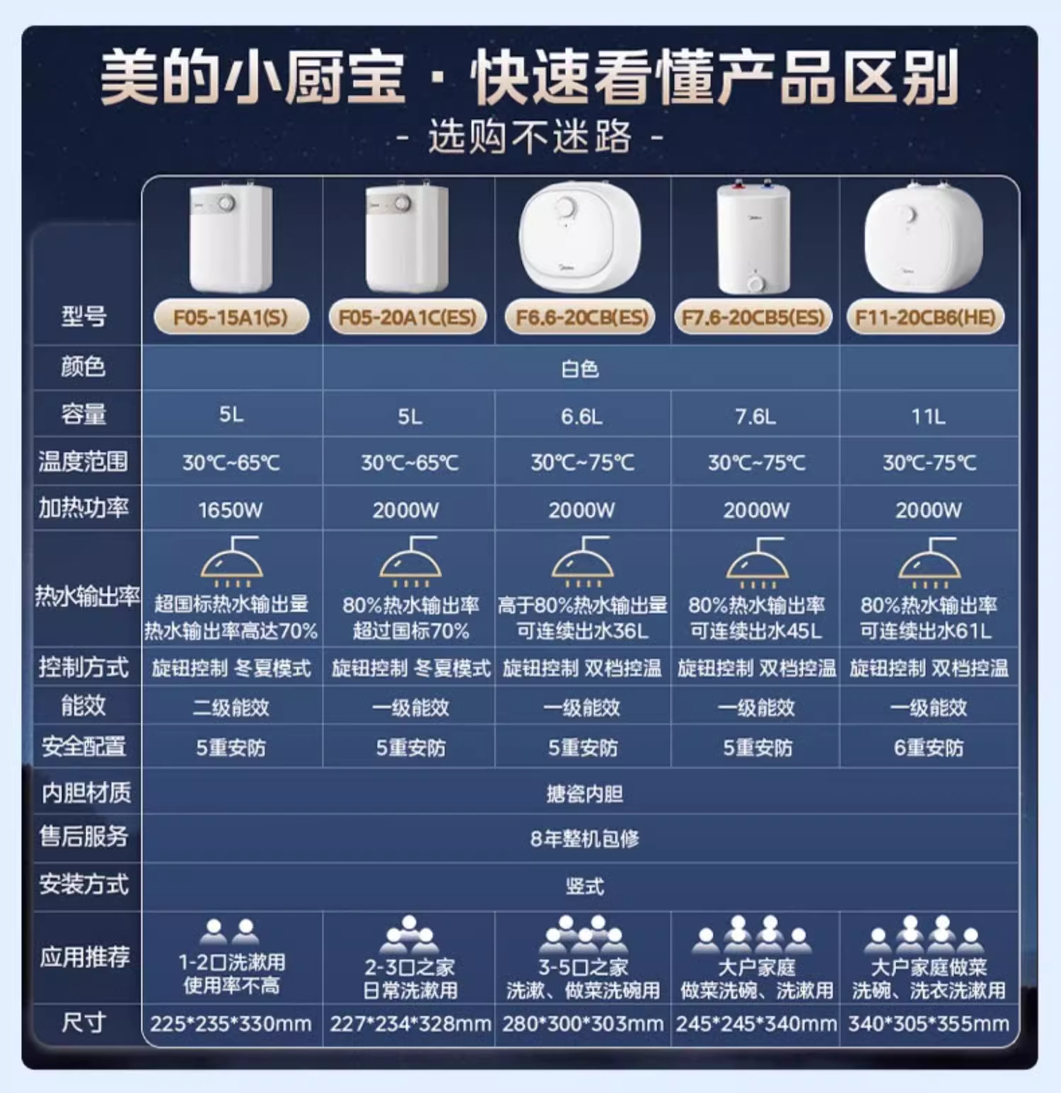 5リットル1650W二次エネルギー効率,5リットル 2000W 1段階のエネルギー効率,6.6リットル 2000W 1段階のエネルギー効率,7.6リットル大容量[F7.6-20CB5(ES)],11リットル超大容量[F11-20CB6(HE)]