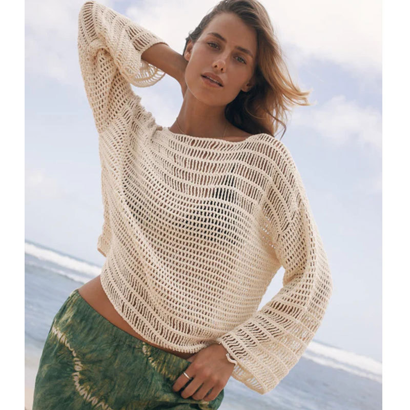 新作クロスボーダー欧米風ビーチドレス セクシーな透かし編みニット長袖ビキニ水着カバーアップ日焼け止め服 レディース