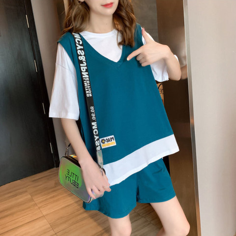 2025 カジュアルスーツ女性の夏の新しいトレンディなスポーツ韓国語バージョン偽ツーピース大きいサイズの女性のルーズツーピーススーツ