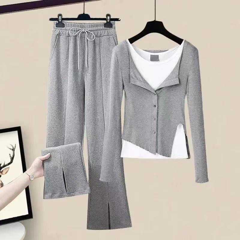 新商品の婦人服スーツ春と秋の灰色の偽の2つの上着の底のシャツのオープンフォークの広い足のカジュアルなズボンの3つのセットの女性