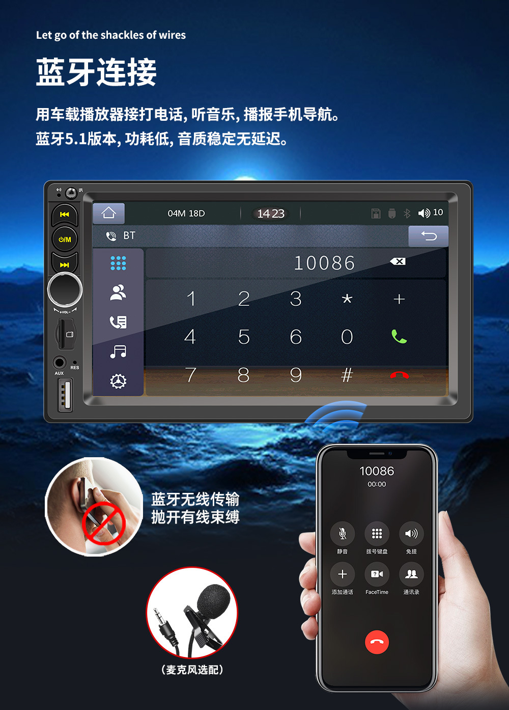 【多种音频输出模式】这款便携式车载屏幕具备蓝牙、AUX和FM发射器音频输出选项。可以通过蓝牙连接使用车载屏幕的内置扬声器播放声音,实现蓝牙免提通话和音乐播放。