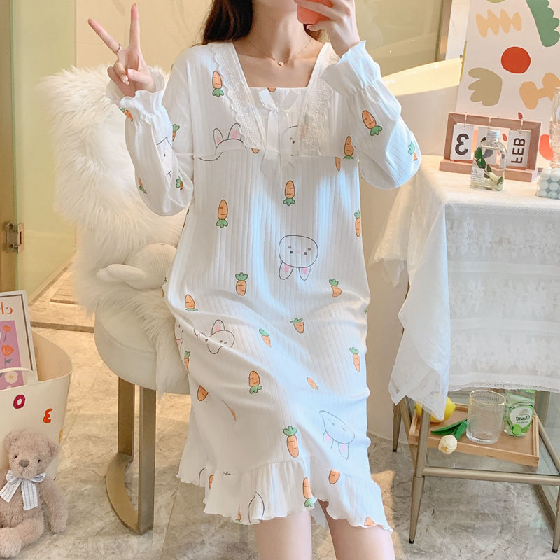 女性用ナイトガウン春と秋和風インかわいい漫画ウサギシンプルなラウンドネックカフスロングホーム服