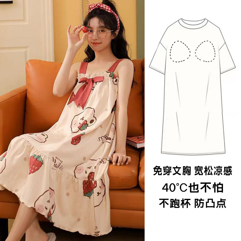 夏の薄い袖なしのパジャマの女性は胸のパッドのかわいいストラップのパジャマのロングスカートの甘い女子の家の服を持って外に着ることができます。