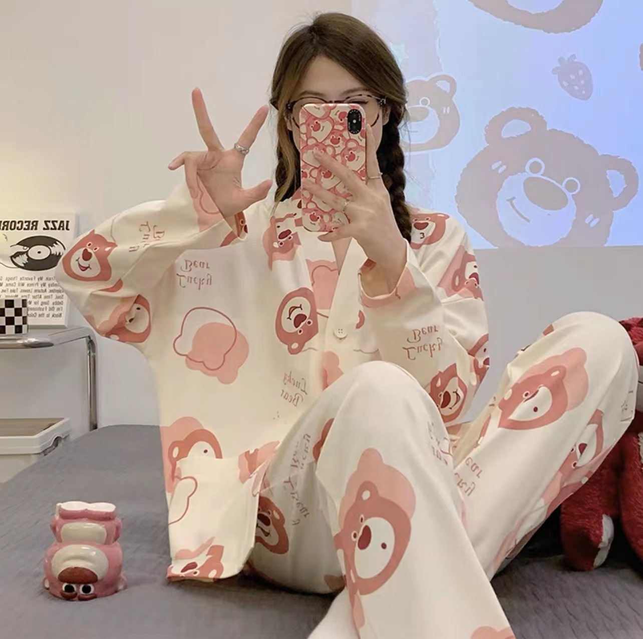 Insかわいいいちご熊長袖長ズボンパジャマ漫画丸首ゆるいカジュアル甘い対外貿易生放送ホームウェア