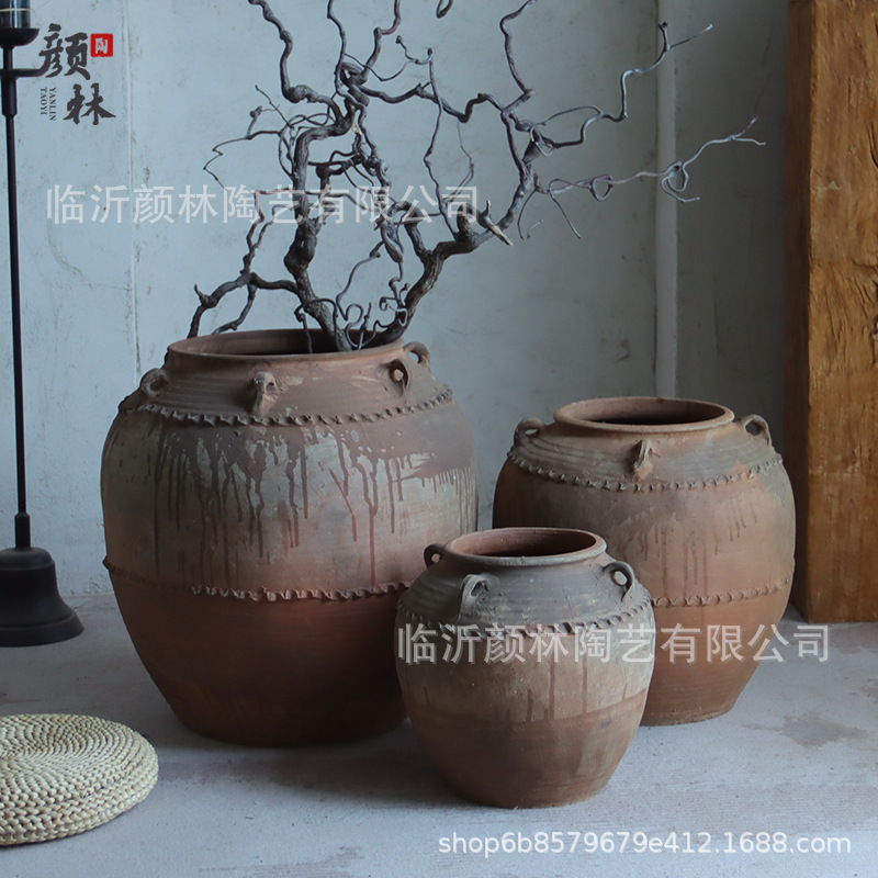 土陶罐大肚带耳仿古罐荷罐落地花盆粗陶花器民宿样板间装饰摆件