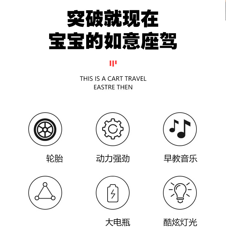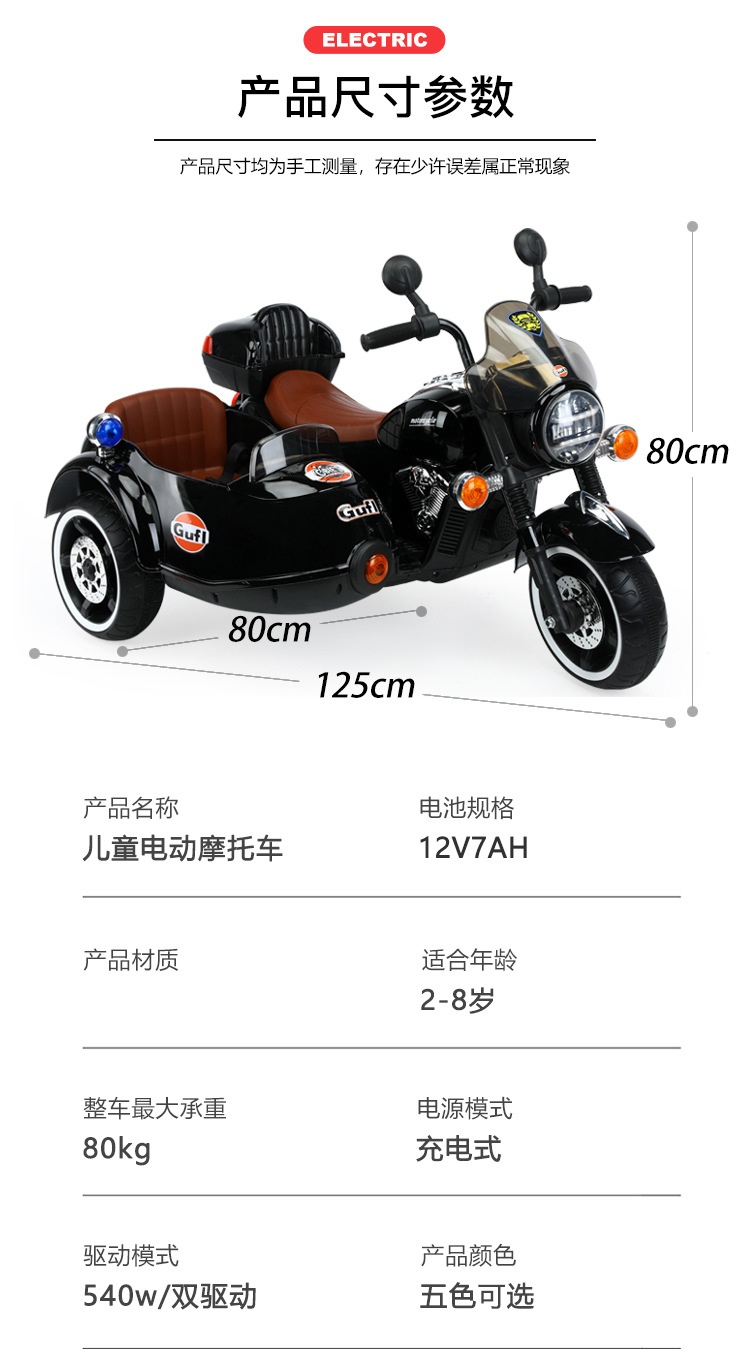 原装配置红色 白色 蓝色配置:12V7A电瓶 双驱540大动力电机,缓启动功能,蓝牙播放器,动感音乐,早教故事,带有USB插口,警报,警笛,炫酷LED警灯,带有喊话器,整车安装简单。