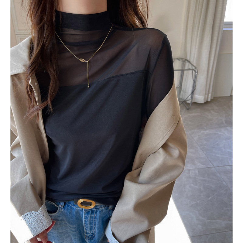 纯欲半高领长袖打底衫女内搭秋冬高级感网纱拼接简约t恤修身上衣