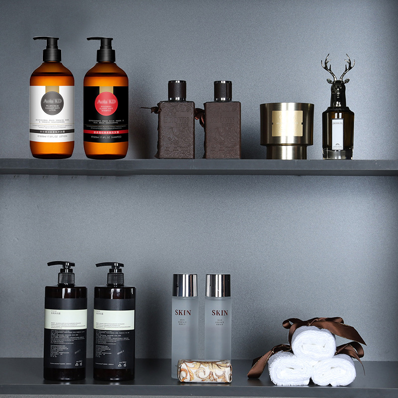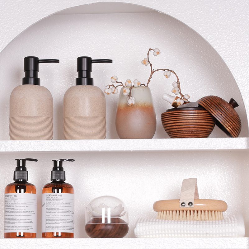 サンプルルームのトイレの浴室のキャビネットは新しい中国式の優雅な風呂の置物の手洗い液を飾って瓶のアロマタオルを押します。