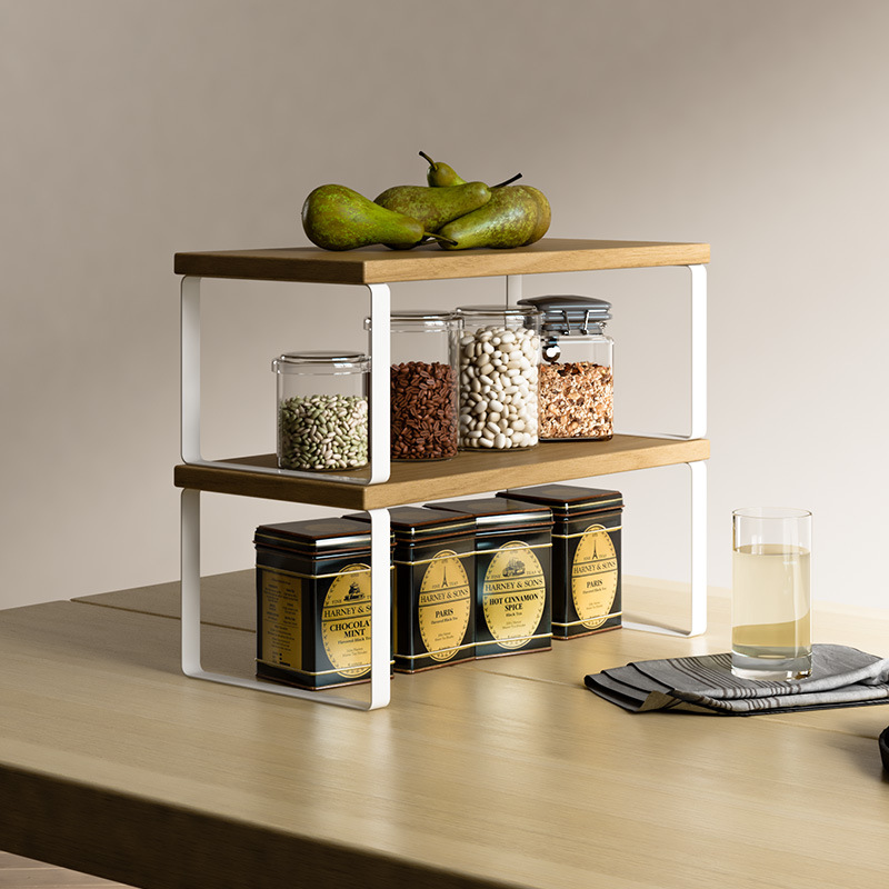 台所のテーブルの上に棚を置いて、棚の中の食器棚の調味料を分けて収納します。