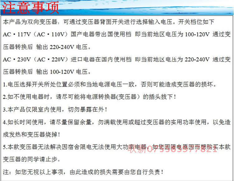 本变压器的输入端插头为国标两相插头,如果是出国使用,有些插座可能不匹配,建议准备一个多用转换插头,有了这个插头可以在世界多数使用。如果您需要插头,可以在店铺选购无需加运费。