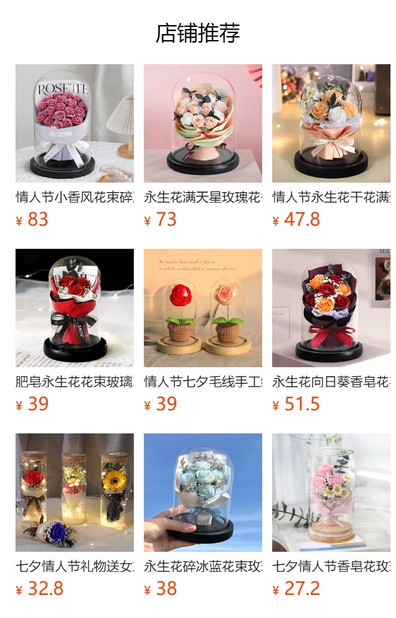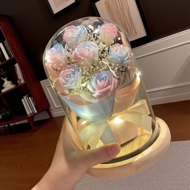 跨境亚马逊永生花7朵玫瑰香皂花束圣诞情人节生日礼物玻璃灯罩