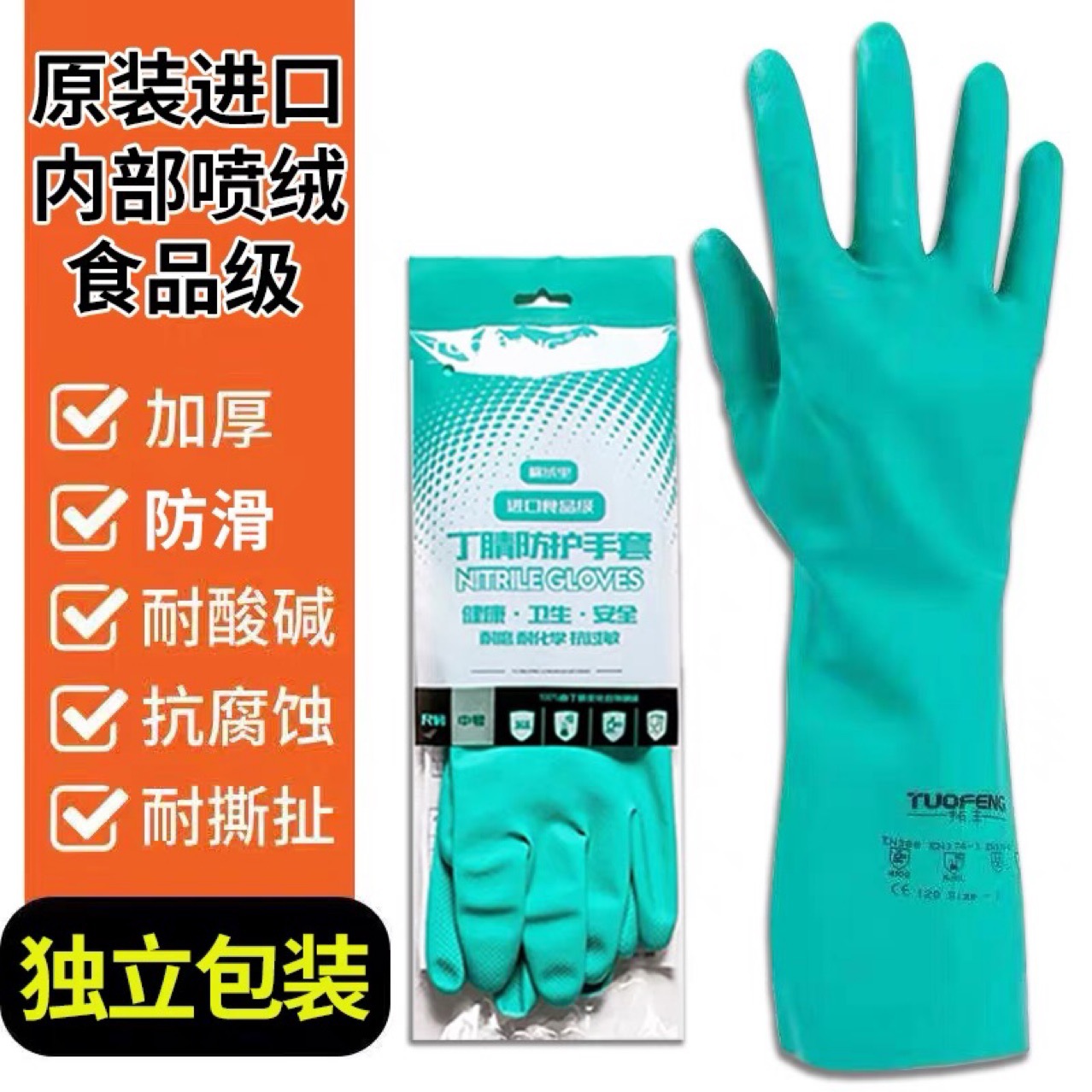 Tuofeng の長く厚みのある使い捨てニトリル手袋は、耐久性があり、防水性と耐油性があり、食品グレードの家事労働保護ゴムです。
