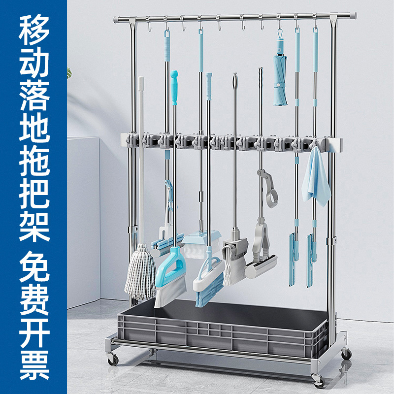 ステンレス移動モップラック床置きラック多機能清潔収納ツールラックフックほうきラック