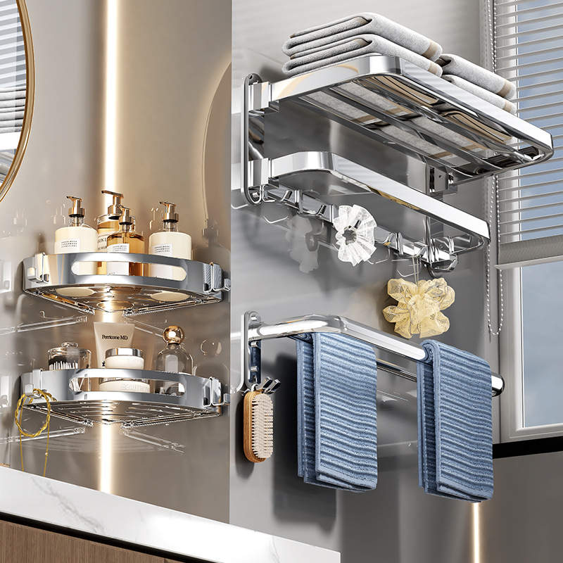 毛巾架免打孔卫生间置物架加厚浴室放衣服挂件套装折叠浴巾架收纳