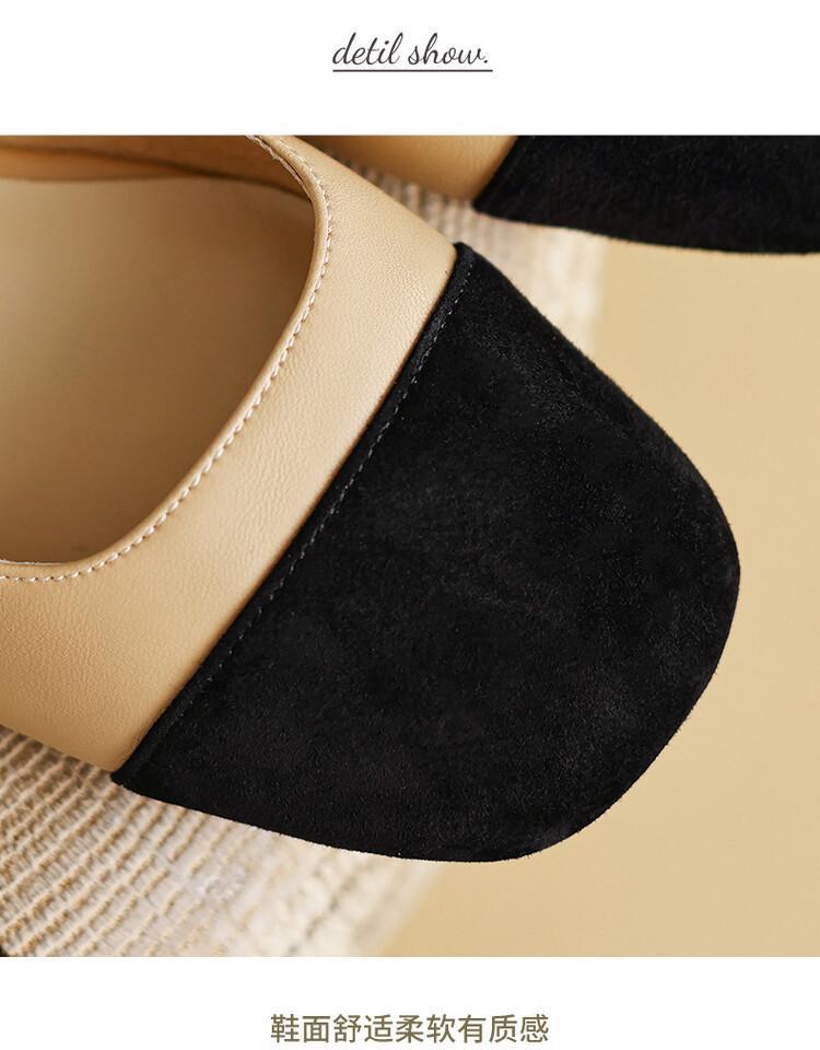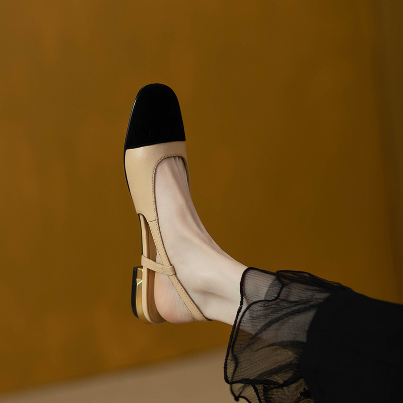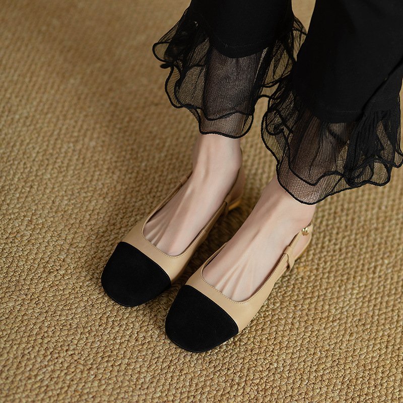 グレープママ同型2025新作フレンチ風小香風配色包頭バックレスサンダルラウンドトゥエレガントローヒールサンダル