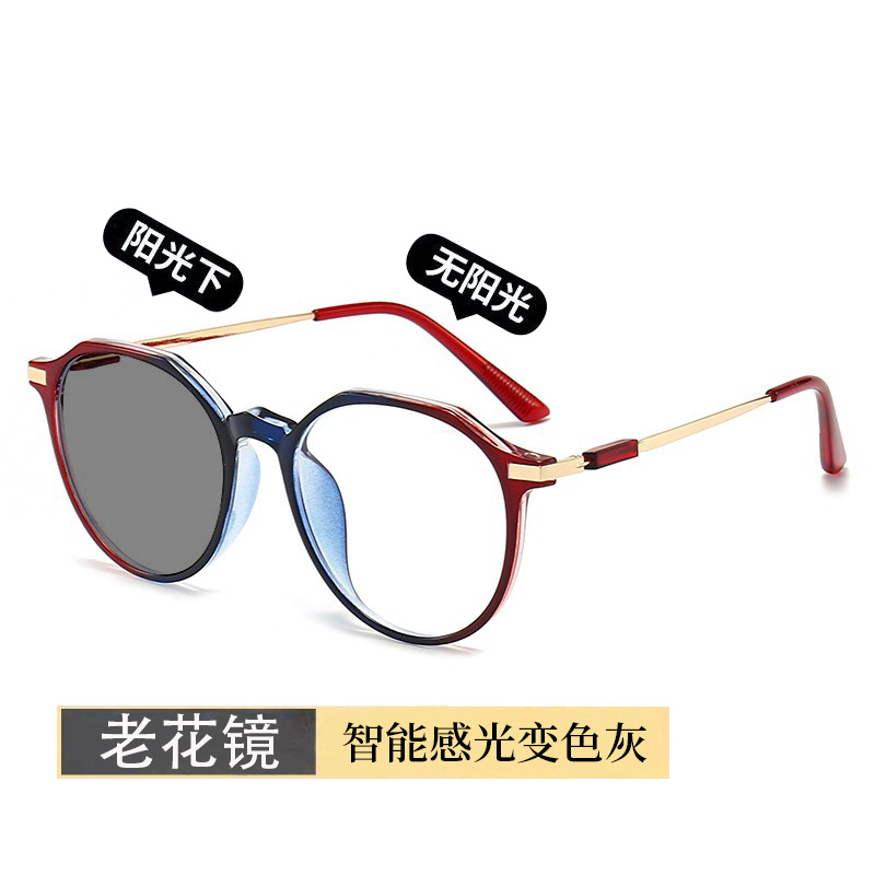 2401知能変色老眼鏡多角形男女不規則フレーム度数ブルーレイ感光グレーメガネ