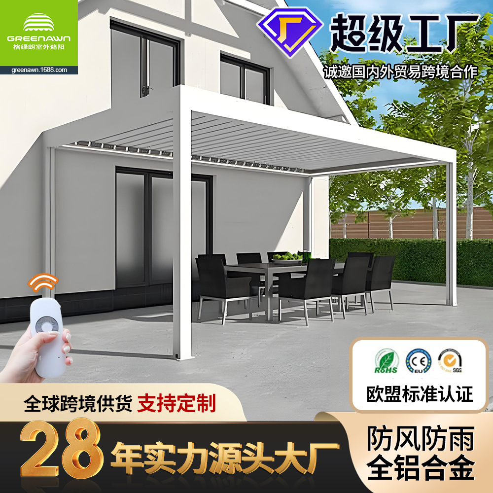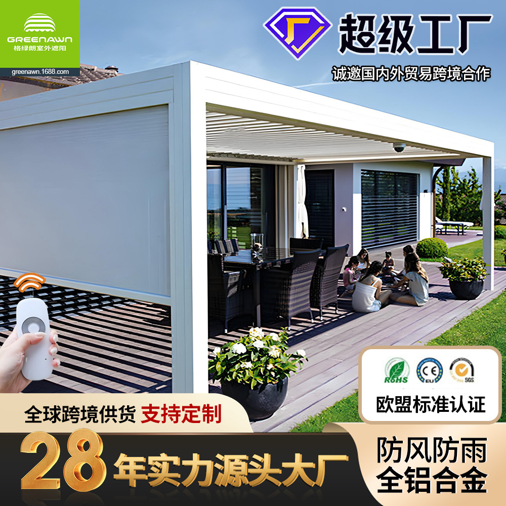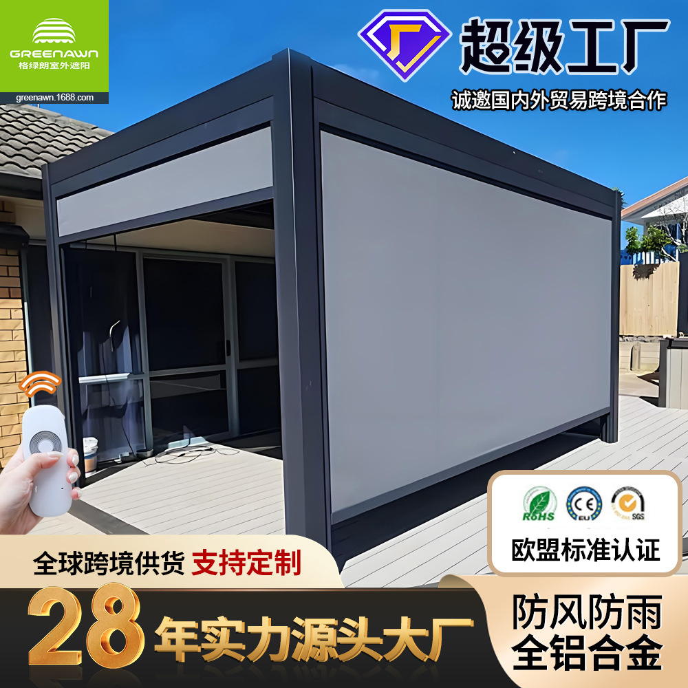 广东格绿朗节能科技有限公司28年源头大厂工厂欧美法式外国高级高端高品质跨境爆品电商出口智能自动电动全铝合金半盒式全盒式伸缩遮阳棚避雨棚折叠手摇手动可伸缩式铝制凉棚曲臂棚别墅庭院门前露天定制厂家制造商