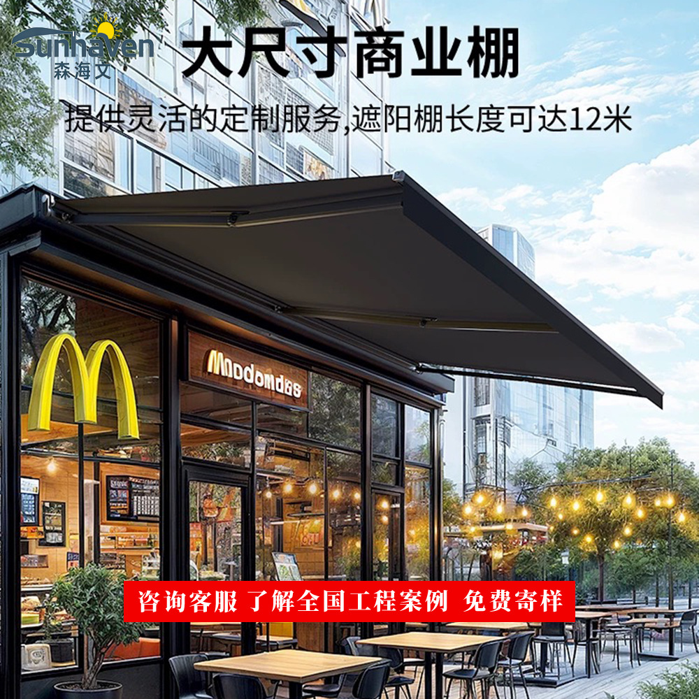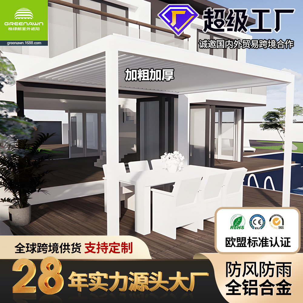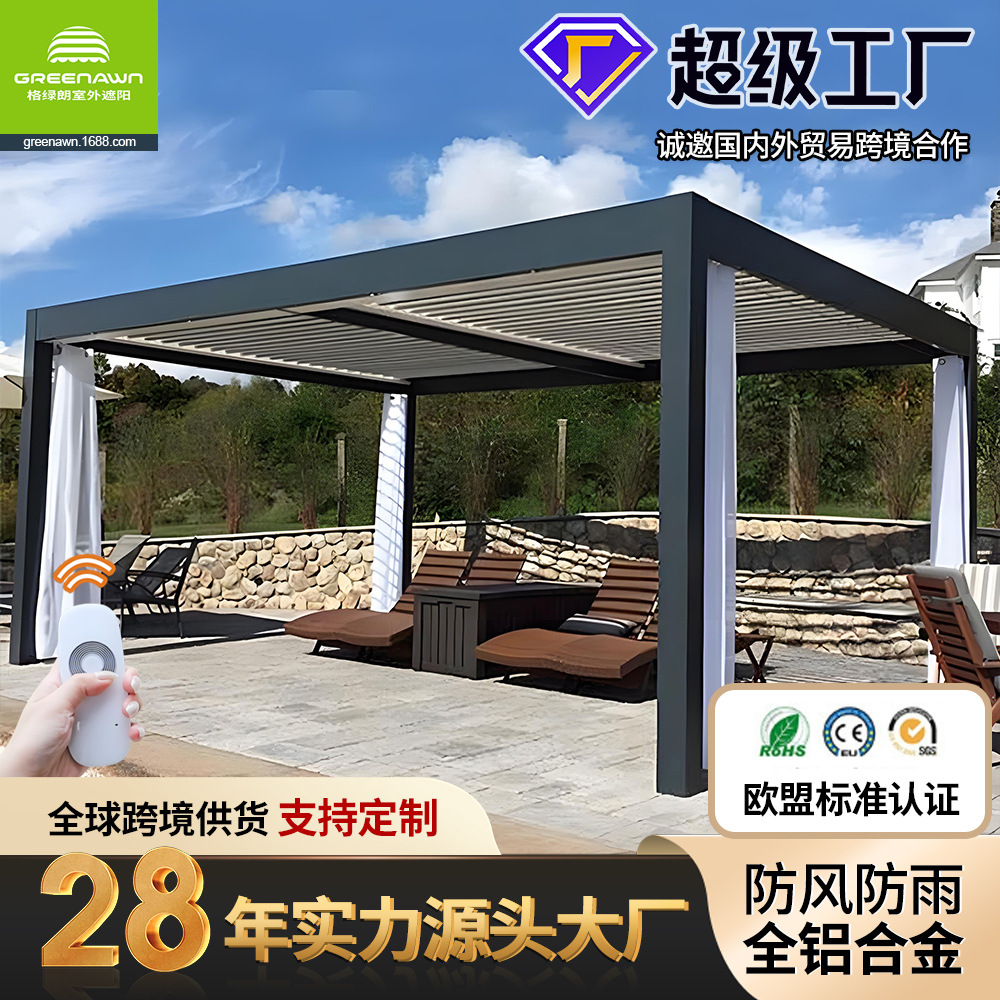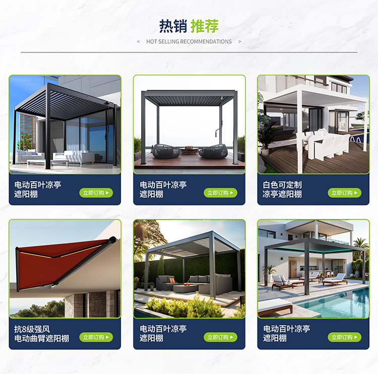 广东格绿朗节能科技有限公司28年源头大厂工厂欧美法式外国高级高端高品质跨境爆品电商出口智能自动电动全铝合金半盒式全盒式伸缩遮阳棚避雨棚折叠手摇手动可伸缩式铝制凉棚曲臂棚别墅庭院门前露天定制厂家制造商