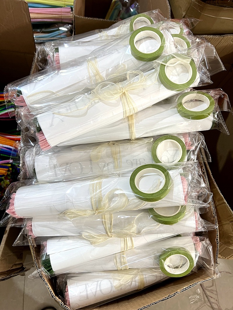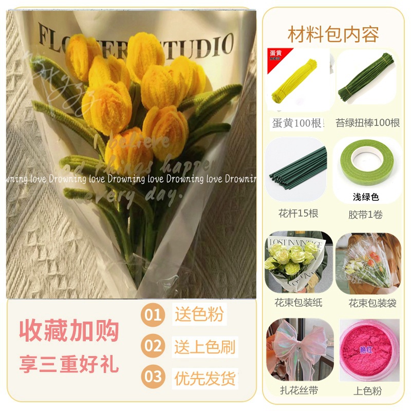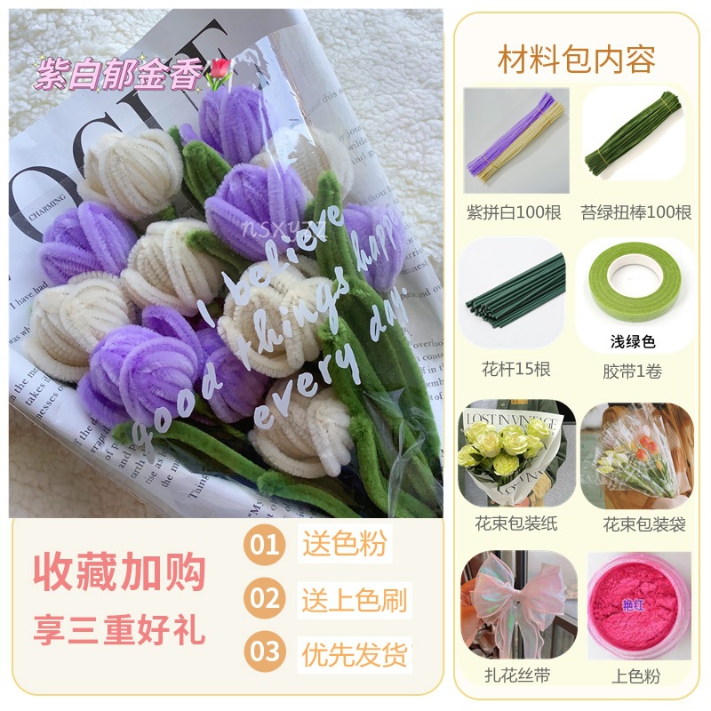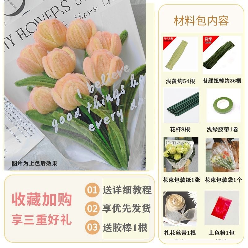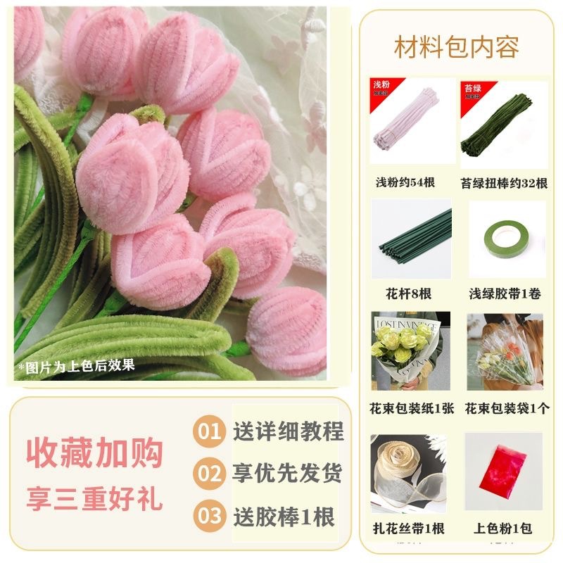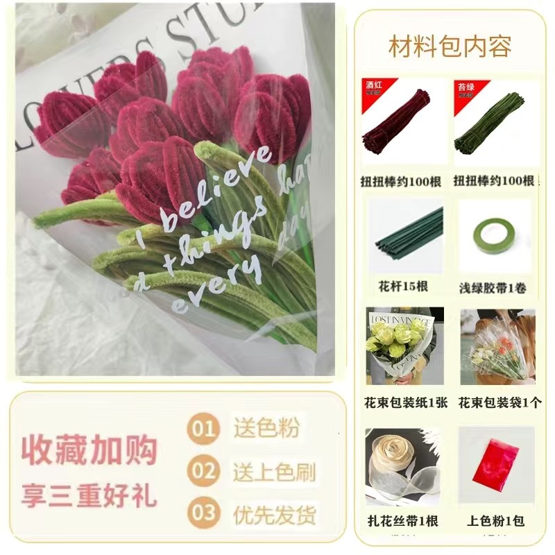 材料包包含 扭棒200根 花杆15根 包装纸1张 包装袋1个 丝带1根 上色粉1包 上色刷1支【配件尺寸看下方图片】外贸款会取出色粉 上色刷发货 请知悉!