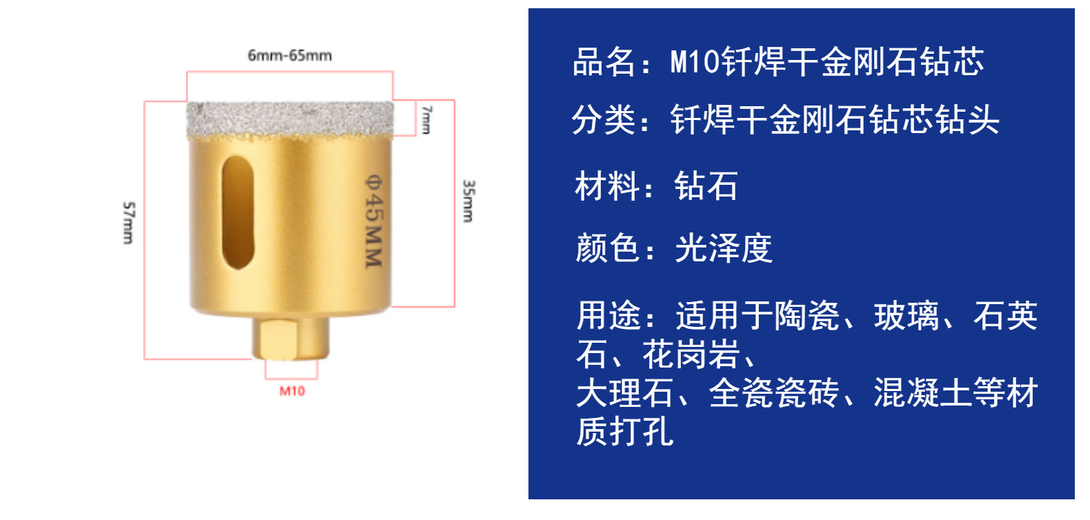 M10ネジ式真空ろう付け乾式ダイヤモンドコアドリルビット タイル穴鋸 花崗岩 大理石 石材用 乾式