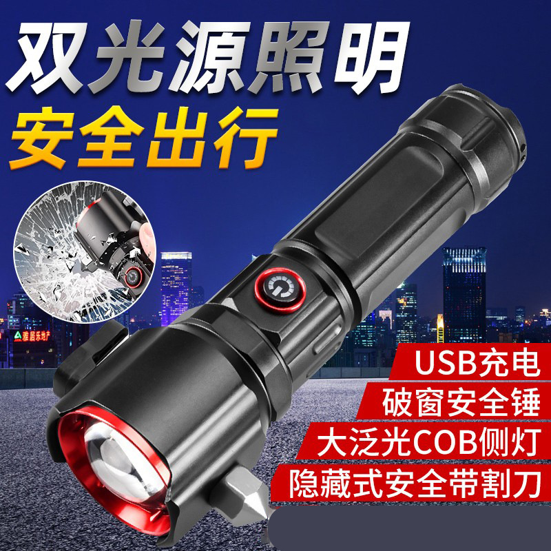 新型白レーザー懐中電灯led超亮遠射type-c充電式赤ブルーレイcob安全ハンマーズームアルミ