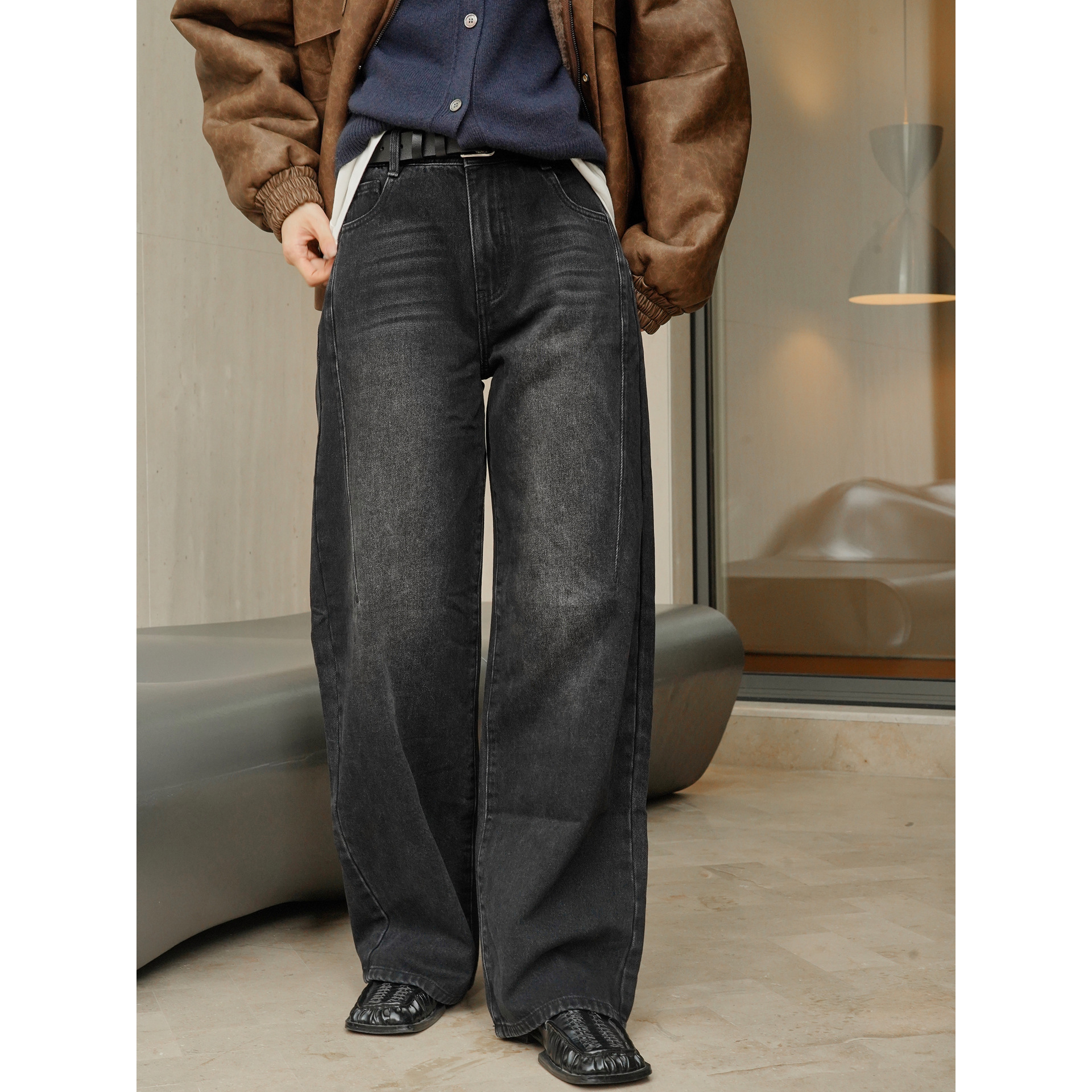 ルフ冬の新作韓国風レトロカジュアルハイウエストストレートジーンズ暖かい厚手ロングパンツ女性用