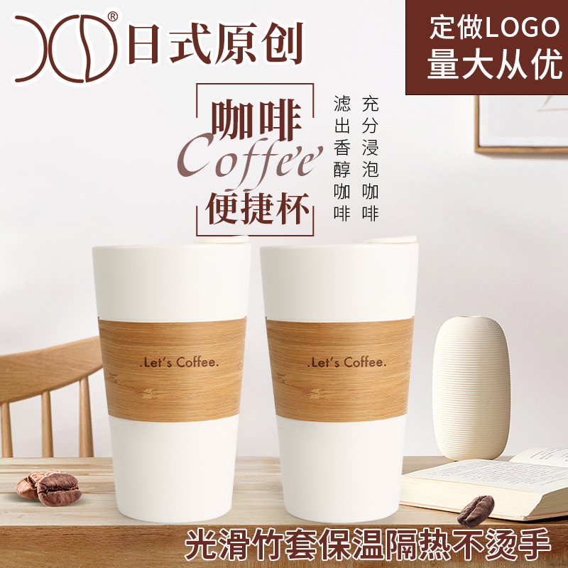 コーヒータンブラー 滑り止め底コーヒーカップ 竹製火傷防止握手魔法瓶カップ セラミック竹カバーカップ