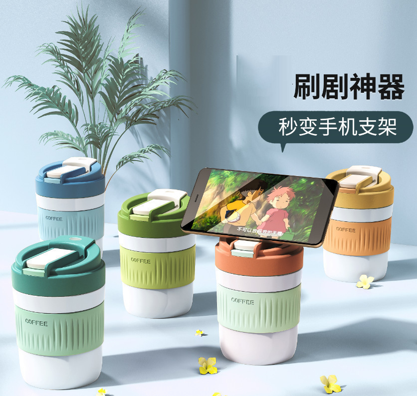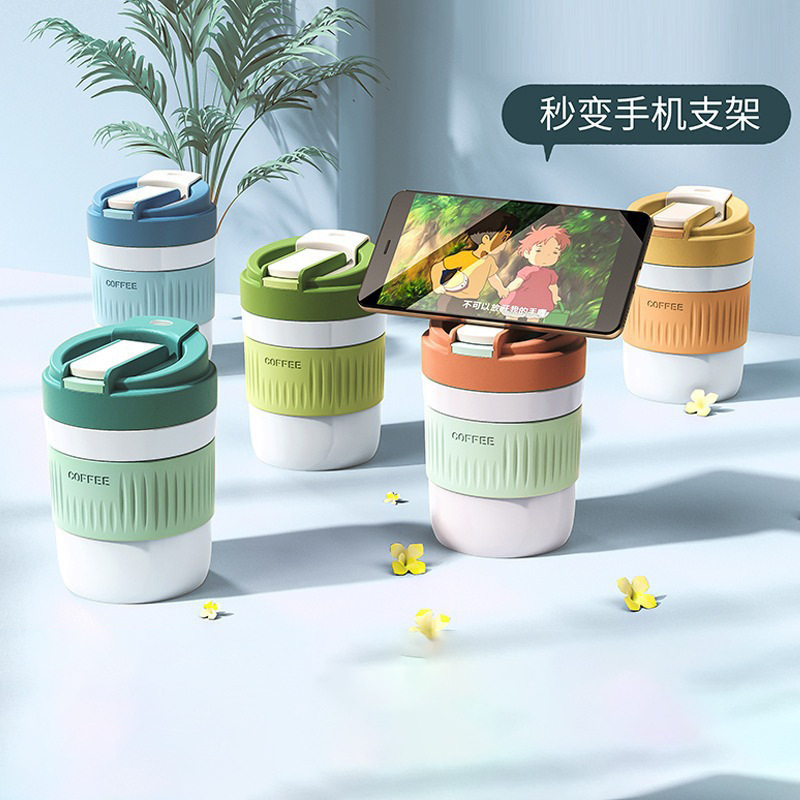加厚双饮吸管杯ins大容量办公室水杯子手机支架杯便携式咖啡杯