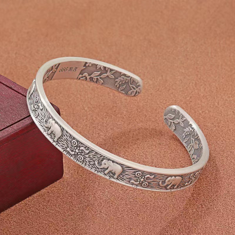 エナメルレリーフ開口素環s925銀ブレスレット男女小象復古手作り古法純銀ブレスレット